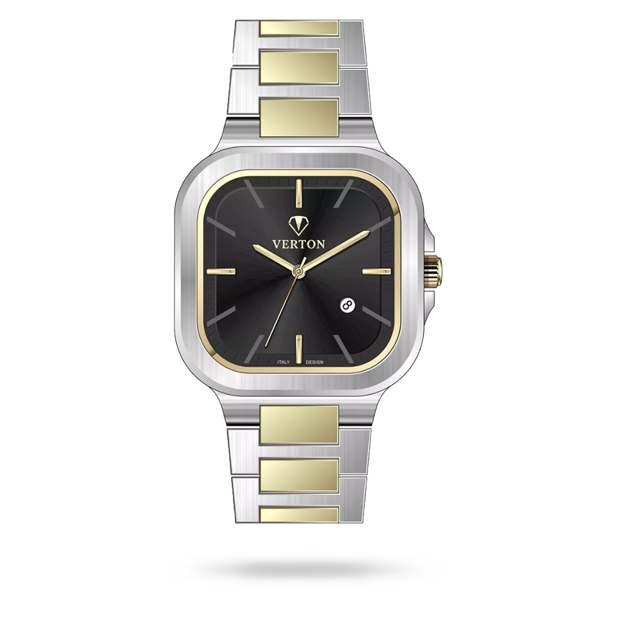 The Verton timepiece is a true expression of Italian elegance and refined craftsmanship. This Calender model, identified by product code VR1102-1190G, features a Golden Steel case perfectly paired with a Golden Steel strap, creating a harmonious and sophisticated appearance. The Black dial adds depth, clarity, and timeless beauty to the design. Offered as a Pair edition, this watch is thoughtfully designed for Gentlemen, making it an ideal choice for those who appreciate precision, luxury, and classic Italian style. Verton watches embody distinctive character, lasting quality, and understated luxury.