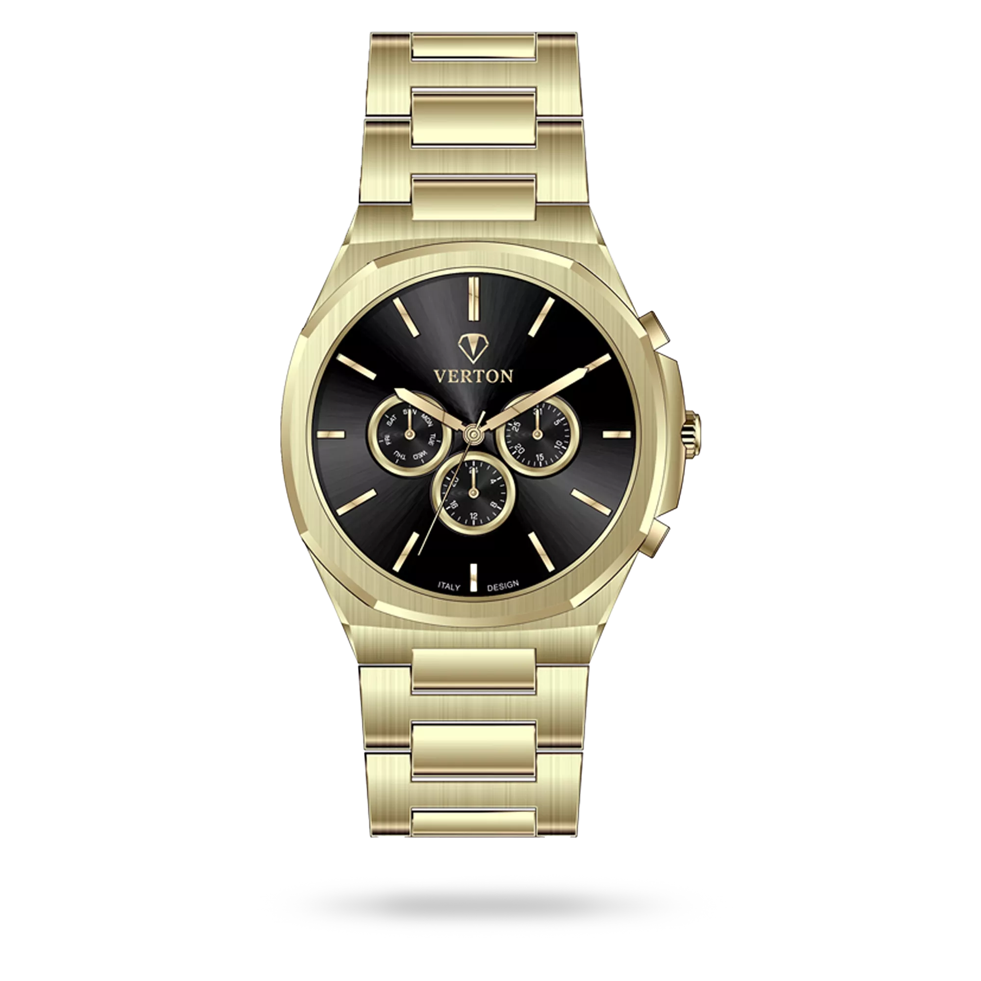 The Verton timepiece is a true expression of Italian elegance and refined craftsmanship. This Full Time model, identified by product code VR4101-1260G, features a Golden case perfectly paired with a Golden strap, creating a harmonious and sophisticated appearance. The Black dial adds depth, clarity, and timeless beauty to the design. Offered as a Pair edition, this watch is thoughtfully designed for Gentlemen, making it an ideal choice for those who appreciate precision, luxury, and classic Italian style. Verton watches embody distinctive character, lasting quality, and understated luxury.